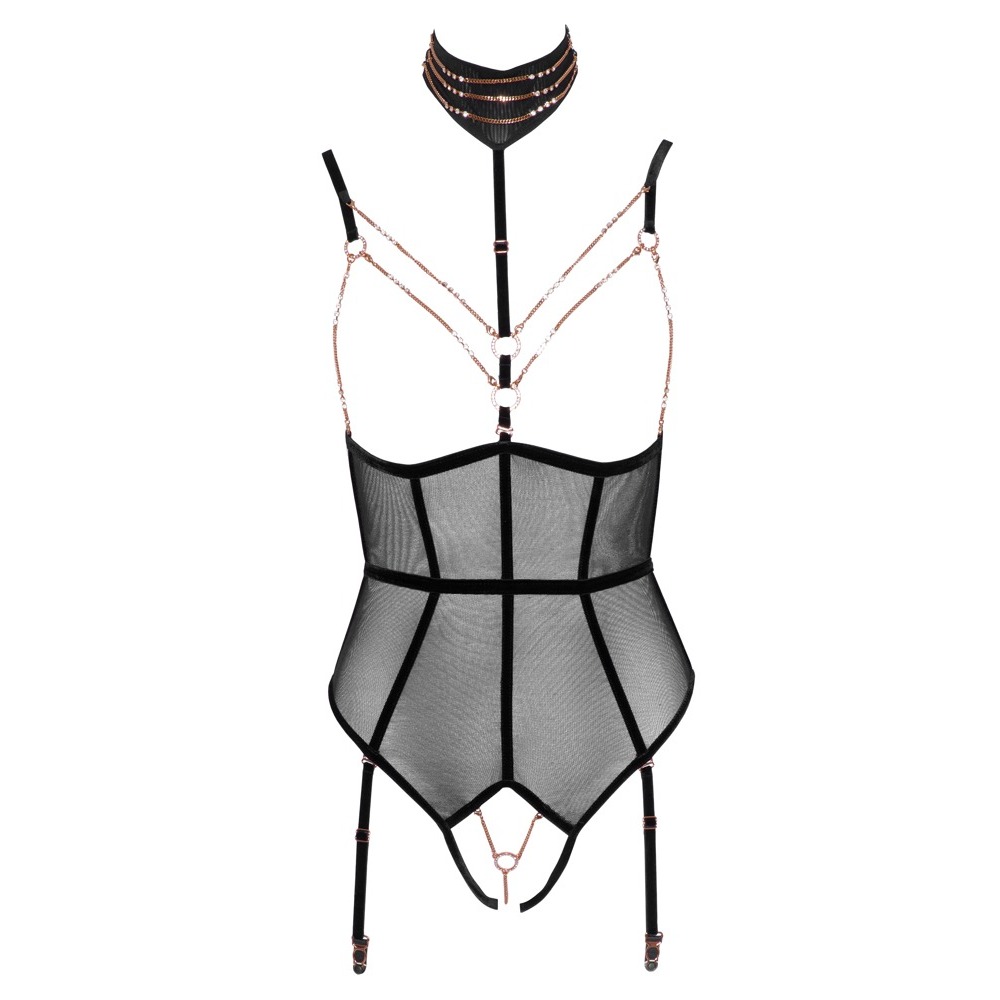 Open cup, Powernet body from Abierta Fina with a completely open crotch area, stretchy velvet straps and rose-gold coloured decoration. The bra and suspender straps can be adjusted. The suspender straps can be removed. There is an adjustable cleavage strap and a choker, with a button at the back that has decorative chains around it.