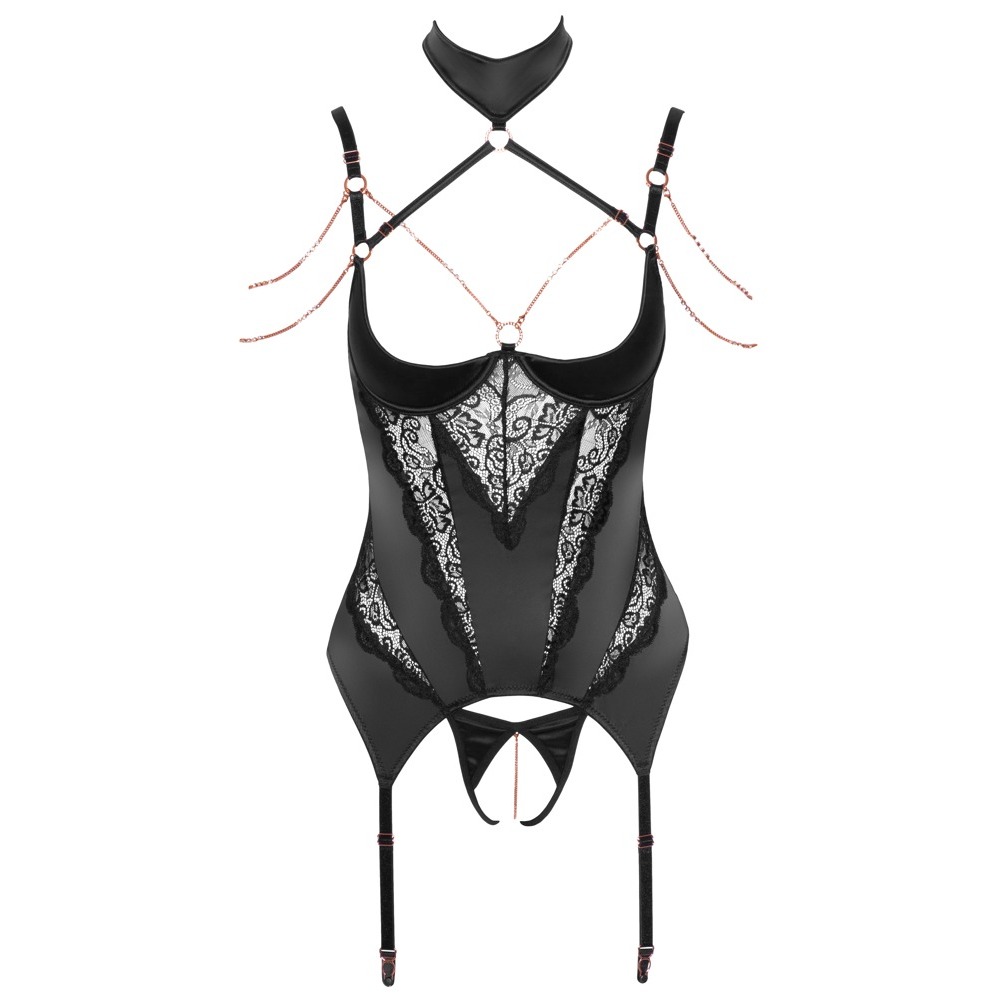 Sensational basque from von Abierta Fina is made out of stretchy satin that has lace inserts that go down the basque and rose-gold coloured decoration. The integrated underwired shelf bra with slightly padded cups emphasise the beautiful breasts and make them the centre of attention.