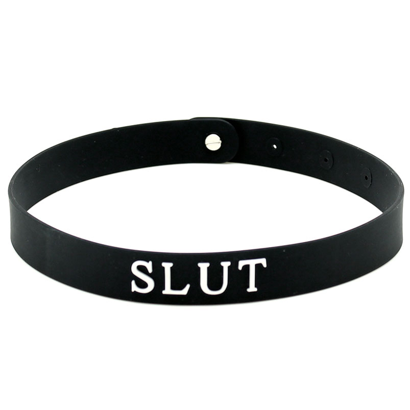 The word SLUT is wrote on the front of the collor in white letters.
