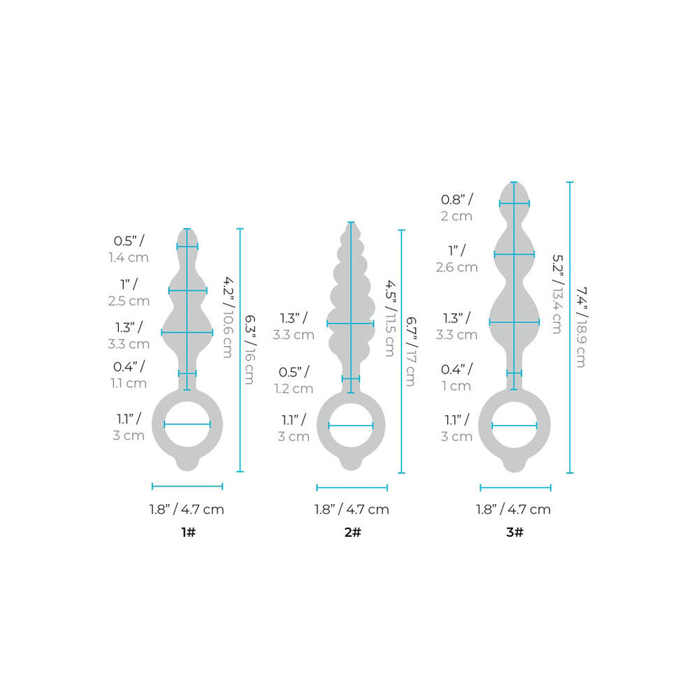 Size up your stimulation with b-Vibe’s Beaded Butties Bundle. This set of three graduated plugs lets you pop into pleasure with gradually increasing beads that massage your sphincter with each thrust. The three sizes of plugs let you size up or down for anal training, and the texture variety provides three different thrilling styles of stimulation. All three plugs are 100% waterproof for use in the bath or shower and allow for easy cleaning.