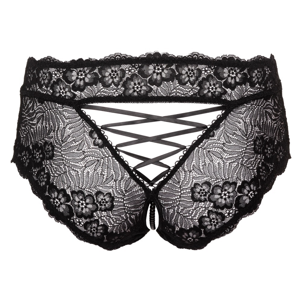 Black, crotchless panties from Cottelli CURVES are made entirely out of delicate floral lace. Soft and stretchy for a perfect fit and high comfort. The elastic and stimulating pearl chain in the open crotch is especially ingenious, as well as the satin lacing in the triangular cut-out at the bottom.