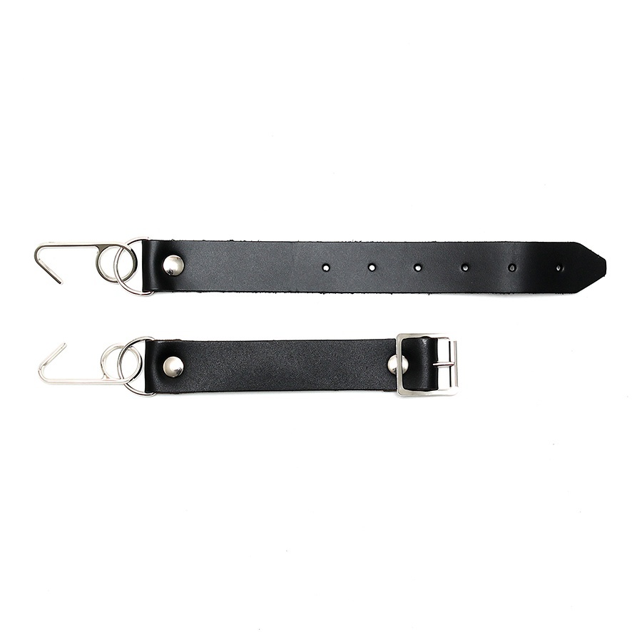 Black leather adjustable strap with metal hooks designed to fit into the corner of the mouth to force a smile.