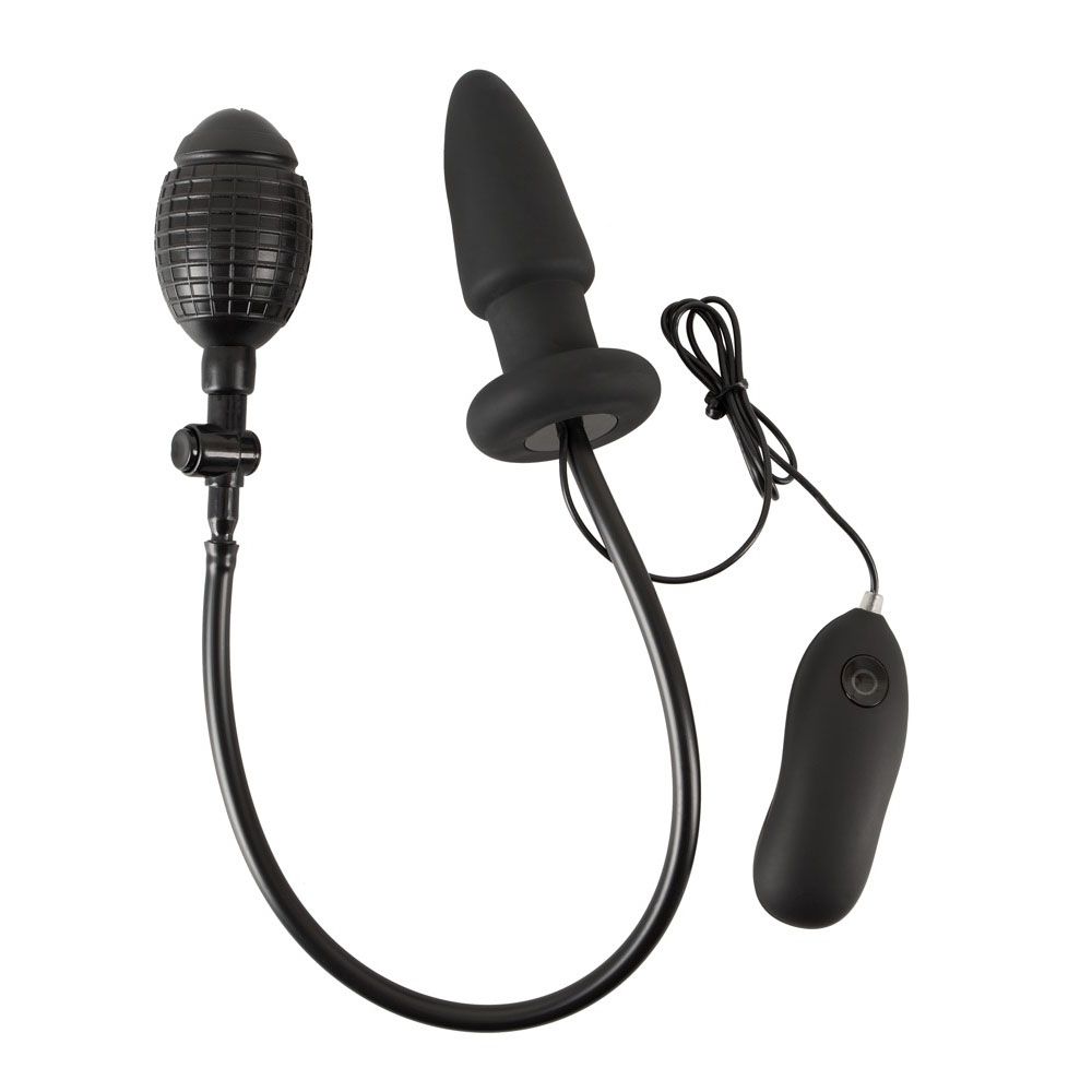An inflatable vibro-butt plug with 7 different vibration modes and remote control on a wire. With a pump ball for easy inflation and an outlet valve to let the air out again.