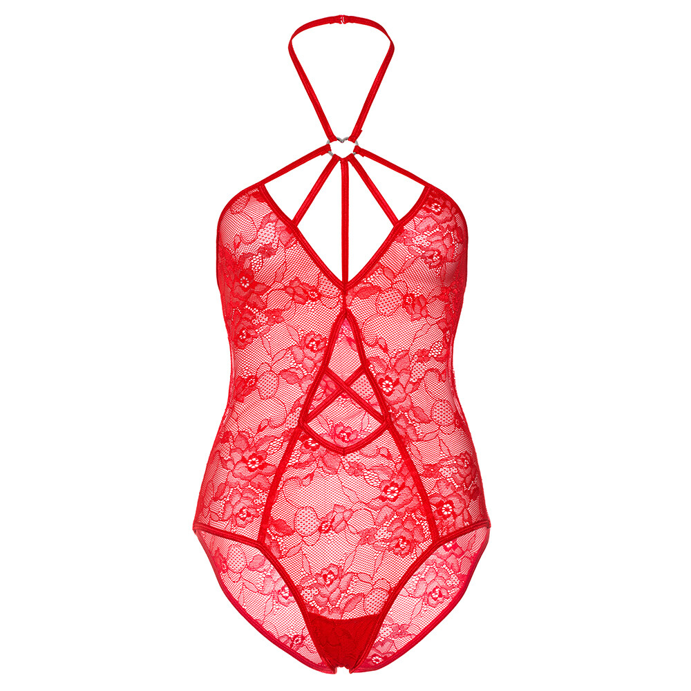 Stretch lace teddy with strappy heart ring halter and keyhole cut-out accent.