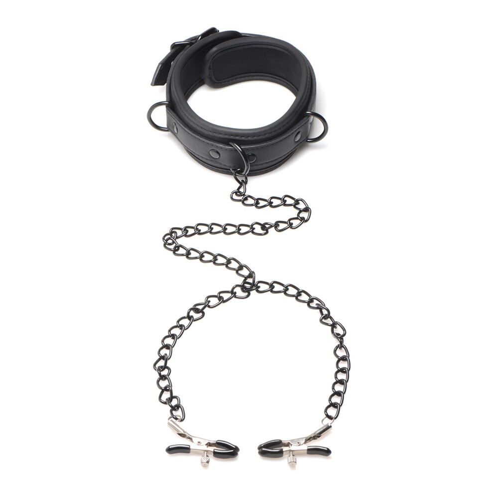 Have your lover kneel in front of you as you place their collar around their neck. The buckles clasp and you make sure the collar fits snug and comfortably so they can feel the gentle, padded and smooth texture of the neoprene. You take the chain at the center of their throat and pull them gently towards you, making them lift their chest. Taking their nipple in your free hand, you take the clamp and place it slowly behind the nipple, on the areola, and adjust the pressure using the small screw. Doing the same on the other nipple, you hear your lover’s breath catch in their throat and gasp as they begin to mingle pain and pleasure, experiencing it all at your hands.