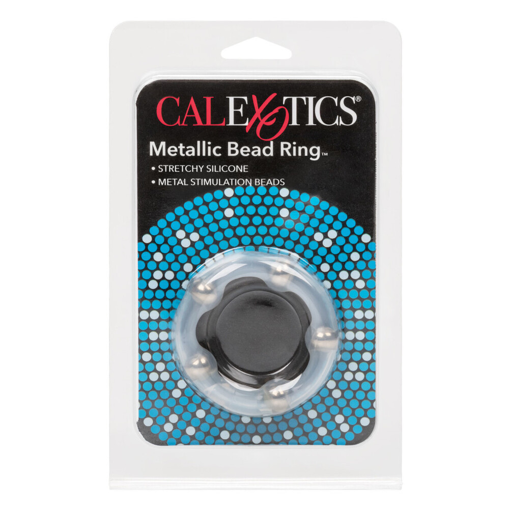 Stretchy enhancement ring with metal beads for stimulating tactile sensations. (Realistic dildo not included)
