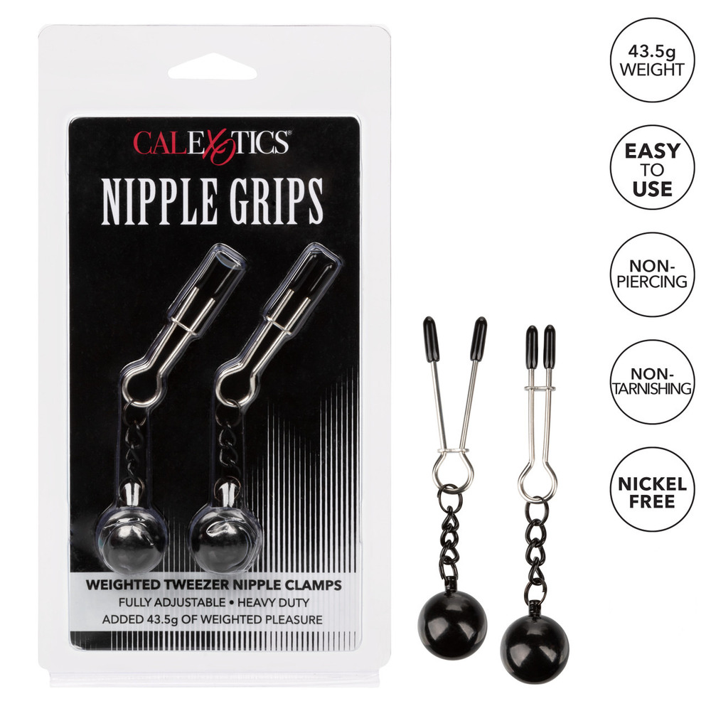 Tweezer-style nipple clamps give you the right amount of squeeze for an incredible nipple play experience. Adjust the tweezers to exactly the pressure you desire, and let the weights pull and tug for even more pleasure.