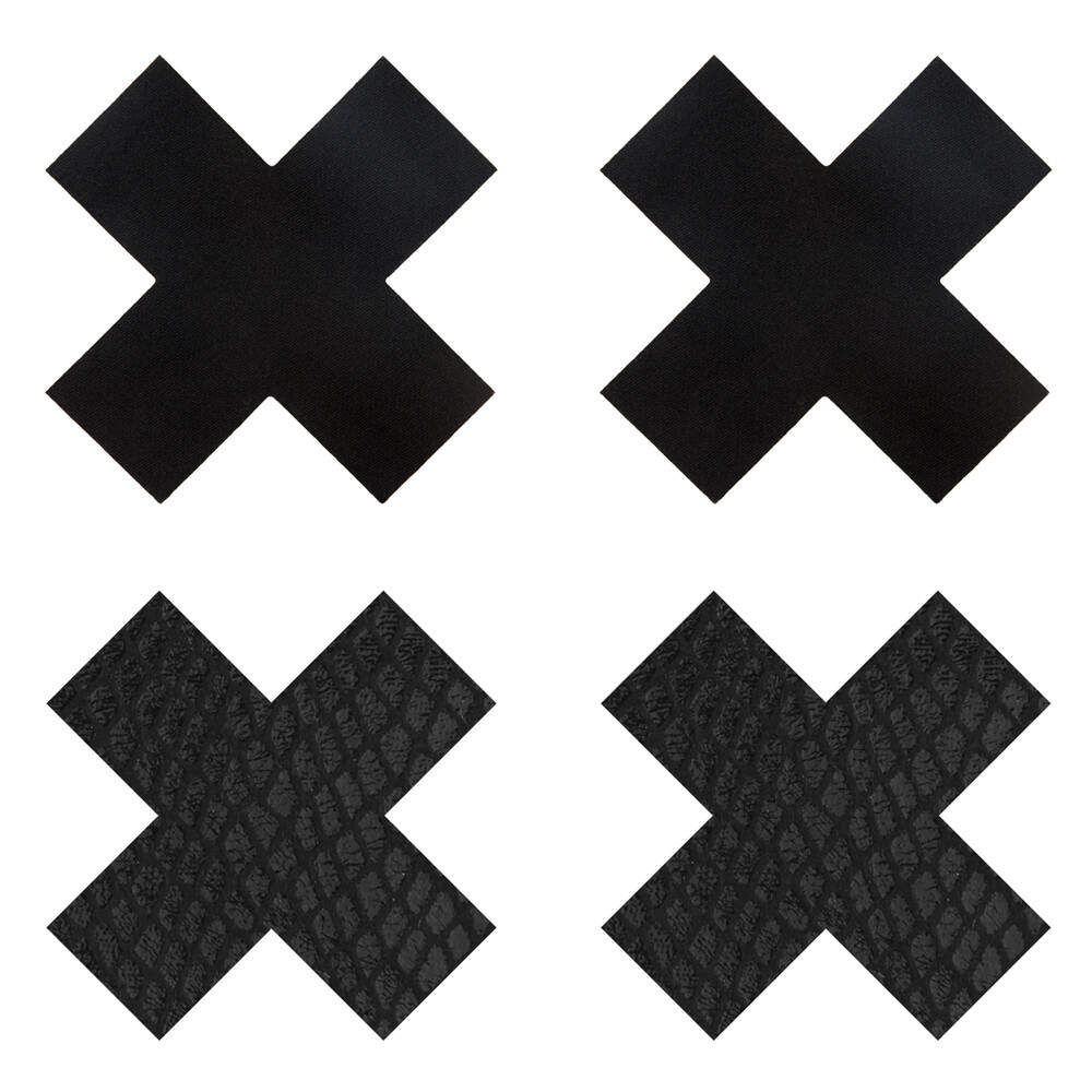 Self-adhesive X-shaped pasties include a black satin set