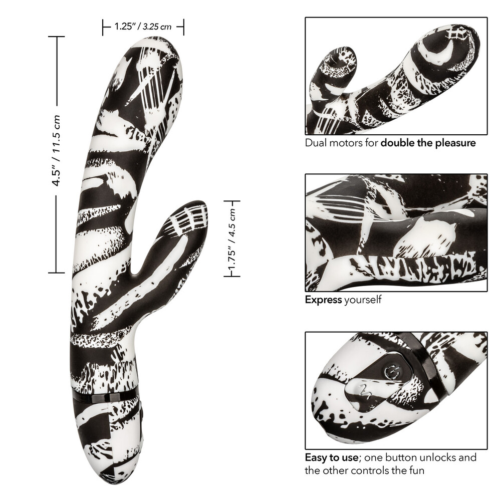 The easy touch buttons allow you to independently control the vibration motors with ease. Indulge in personalized pleasure while the curved wand shimmies to the rhythm of 10 vivacious vibrations, passionate pulsation and erotic escalation.